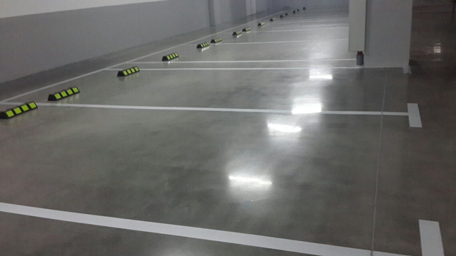 4、車庫環(huán)氧地坪:車庫環(huán)氧地坪能有效地防止停駛車輛帶來的灰塵,尤其是陰雨天的泥濘和水漬。易于清潔,衛(wèi)生環(huán)保,多層涂覆對混凝土、水泥地表有良好附著力。處理后地坪耐磨、抗壓、抗彎強度高于一般水泥沙漿。無毒無味,助燃,多層涂。色彩多樣化,顏色較為鮮艷,并通過現(xiàn)代化調(diào)色技術(shù),使停車場能的色條和諧統(tǒng)一,美觀大方。但是由于是有機材料、易老化。而且環(huán)氧底涂是堿性的,混凝土是酸性的,當遇有下面潮濕時堿性更強,容易造成粘接力失效而造成脫殼。而且維護較頻繁,一般3-5年進行一次維護翻新。